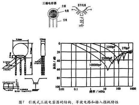 由于普通的兩端電容有引線電感,所以總的剩余電感較大,自諧振點也比較低。為了改進普通引線式電容器的自諧振、且自諧振頻率偏低的問題,村田制作所曾發(fā)展了一種引線式三端電容器,見圖7。與兩端電容相比,這個電容的上引線化成了兩根(所以三端電容有三根引線)。三端電容器的這兩根上引線化成了信號傳輸線的一部分,于是引線電感與電容器變成了一個“LC”濾波器。正是三端電容器巧妙地利用了引線電感,使得三端電容器對干擾的抑制作用更好。三端電容器也有自諧振問題,為了最大限度地限制這個問題,使用時三端電容器接地的這根引腳的長度應(yīng)該受到限制。