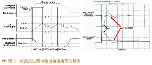 接下來以UCC3915為例說明熱插拔過程中輸出電流電壓的情況。圖3中,左邊圖形是UCC3915的輸出電流、輸出電壓、即時電容電壓的波形,可以看到當輸出電流上升到ITRIP時,計時電容開始充電,電壓上升,開始計時;如果輸出電流超過ITRIP并一直上升到IMAX(設定的最大值),由于此時MOS管工作在線性模式,將最大輸出電流限制在這一水平而不讓輸出電流上升,因此輸出電流就會被限制在IMAX。