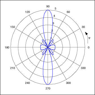 在無線廣播的天線陣列中通常通過在多發射器的每一路驅動信號中引入相位延遲來控制波束的寬度和方向。延方向排列的單天線在延x–y平面的所有方向的輻射是相同的。將幾個發射天線排列起來可以使無線電波的傳播被約束在x–y平面上有限的幾個波瓣內。對于給定的天線間距,波瓣的寬度隨著無線電波頻率的增大和天線數量的增多而減小。例如,五單元天線矩陣發射零相位延遲的信號(即完全相同的信號)產生的典型輻射圖形如圖2所示。