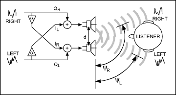 當聆聽兩個揚聲器發出的聲音時,左聲道的聲音先到達左耳,后到達右耳;右聲道的聲音先到達右耳,后到達左耳。右耳聽到較低音量的左聲道信號,左耳聽到較低音量的右聲道信號。這種效應稱為音頻串擾(圖1)。