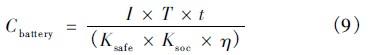 式(8)(9)中I為負(fù)載所需電流,T為負(fù)載每日工作小時(shí)數(shù)。Ta為平均日照時(shí)間。t為連續(xù)雨天數(shù),Ksafe為安全系數(shù),Ksoc為蓄電池容許放電深度,η為變換器效率。按三段式10小時(shí)充電法,在恒流充電階段,充電電流icharge為0.1Cbattery。則恒流充電階段,充電功率為: