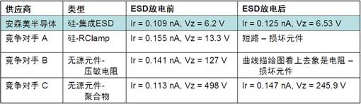 此外,便攜設(shè)備可能遭受多次的ESD電壓應(yīng)力,這在中國(guó)北方地區(qū)表現(xiàn)得猶為顯眼。因?yàn)?,外部保護(hù)元件在多種ESD應(yīng)力條件的性能猶為重要,直接決定著便攜產(chǎn)品的可靠性。因此,同樣可以對(duì)壓敏電阻、聚合物和硅ESD二極管等保護(hù)元件在Tesec直流測(cè)試條件下測(cè)試,每個(gè)元件都施以總計(jì)2,000次的15 kV接觸放電ESD脈沖(正向及負(fù)向各1,000次),每?jī)纱蚊}沖的時(shí)間間隔為0.1秒。表2所示的測(cè)試結(jié)果顯示,安森美半導(dǎo)體的硅集成ESD保護(hù)元件在多重應(yīng)力條件下仍然維持極佳的性能,而競(jìng)爭(zhēng)器件要么損壞,要么性能退化較嚴(yán)重。
