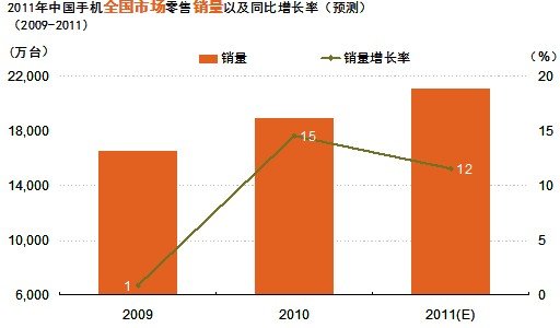 2011年上半年中國的手機市場在3G加速發展,智能手機大力推廣以及運營商的推動共同作用下延續了2010年的增長勢頭,但是2011年下半年的手機市場規模與上半年相比將略有下降,銷量將達到1.02億臺,銷售額將達到1166億元。據GfK預測,2011年全年手機銷售額將達到2352億元,手機銷量將達到2.1億臺,同比上升12%。