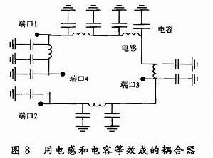 由于第二部分設計的天線傳輸線阻抗是50 Ω,所以1/4傳輸線的阻抗是70.7 Ω,將710 MHz代入,則可以求得L=15.8 nH,C=3.17 pF。這樣,就可以設計出180°的混合耦合器如圖8所示。將耦合器的3,4端口通過通孔連接天線,1,2端口接饋電網(wǎng)絡,就可構成一個雙天線的去耦合系統(tǒng)。