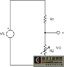 圖 1 顯示的是您如何使用一個分壓器測量電阻。VE 表示激發電壓。RG 值為: