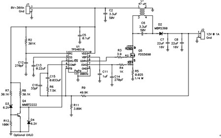 構建起如圖3 所示電路,并對其進行描述。該電路可在汽車市場獲得應用。這里,其擁有一個8V 到36V 的寬范圍輸入,可以為穩定12-V 輸出以上或者以下。汽車市場更喜歡使用陶瓷電容器,原因是其寬溫度范圍、長壽命、高紋波電流額定值和高可靠性。結果,耦合電容器(C6) 便為陶瓷的。這就意味著,相比電解電容器,它擁有較高的AC 電壓,同時這種電路會對低漏電感值更加敏感。
