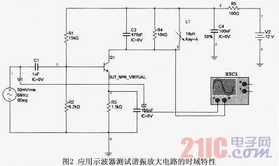 在小信號諧振放大中,電路的輸入信號中除了所需要的信號外還有不需要的信號,它們的頻譜往往不同,所以用選頻的方法,選取需要的頻率分量,抑制不需要的頻率分量。另外,其中有用信號的幅度往往也很小,處理這種信號必須具有選頻和放大雙重功能。小信號諧振放大器電路中晶體管集電極負載是LC并聯諧振電路,其阻抗是隨頻率而變化的,回路諧振頻率f0上的阻抗為純電阻并且是最大的,因此諧振放大器在負載回路的諧振頻率上具有最大的電壓放大增益,稍離開此諧振中心頻率,電壓增益就會迅速減小。在分析中采用仿真軟件來測試諧振放大電路的時域的輸入輸出波形。分析測試電路如圖2所示。