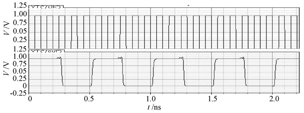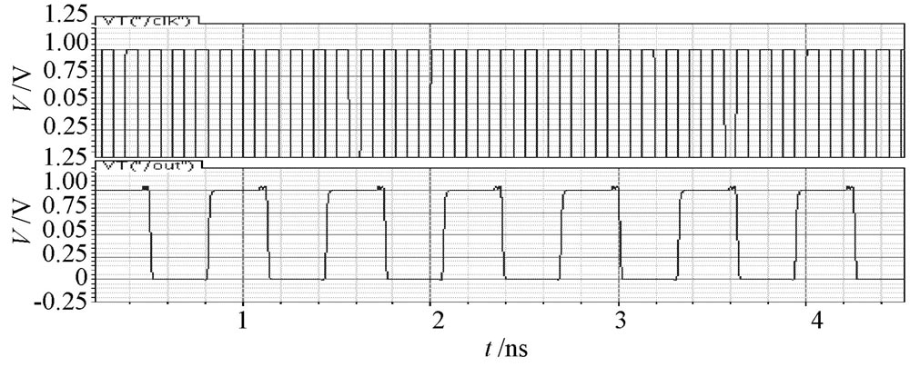 采用Cadence 公司的spect re 仿真器對設計的分頻器分別仿真, 仿真電源電壓為1 V, 結果表明: 在典型工藝參數條件下,基于CML 電路結構的五分頻器最大工作頻率是8 GHz, 最小工作頻率是1 kHz, 當工作在8 GHz 時, 功耗為1. 7 mW, 輸出信號占空比為49. 76% ; 基于T SPC 電路結構的五分頻器最大工作頻率是10 GHz, 最小工作頻率是10 MHz, 當工作在10 GH z時, 功耗采用10 ns 內的平均功耗, 功耗為0. 2 mW, 輸出信號占空比為49. 92%.由于是單端輸入輸出, 基于T SPC 電路結構的分頻器抗噪聲能力較弱。最高工作頻率下的仿真結果如圖4, 圖5 所示。