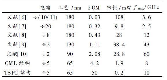 式中: fmax 是分頻器的最高工作頻率; P 是分頻器在最高工作頻率下的功耗, 表2 為本文設計的分頻器和其他文獻中介紹的分頻器作對比,所有的分頻器均采用CMOS工藝, 對比表明本文設計的5 分頻器性能較優,在65 nm 工藝下具有明顯的功耗低優勢, 尤其是采用TSPC 電路結構的分頻器, 功耗極低。