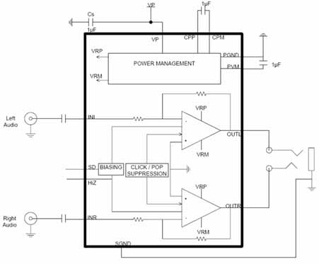 圖4:NCP2815“長播放時(shí)間”立體聲耳機(jī)放大器框圖。