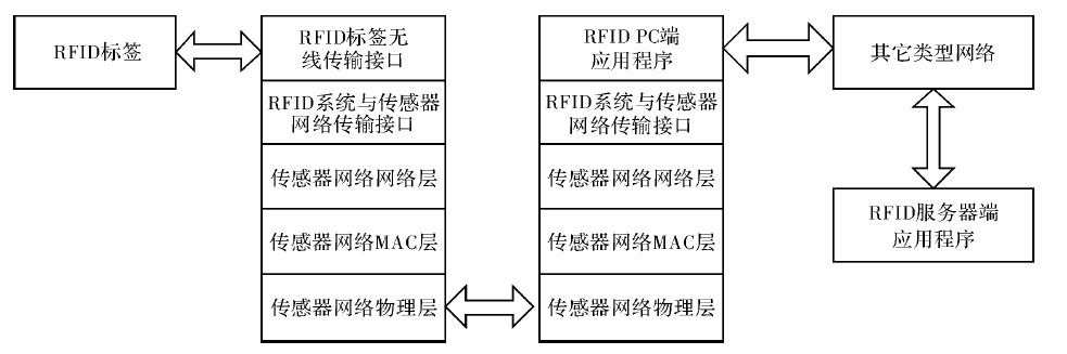 圖3 給出了WSN 與RFID 的融合方案協議層結構示意圖,顯示了兩者融合的可行性和價值所在,無線傳感器網絡與RFID 系統相結合,將RFID 的識別信息通過WSN 網絡,傳輸到RFID 服務器或其他網絡。
