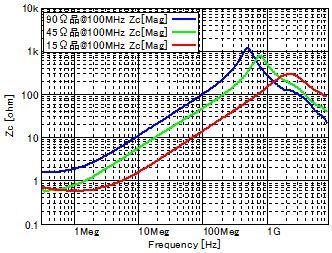圖5顯示的MHL信號線使用各種共模扼流線圈時的輻射噪聲/信號波形評測結果。共模扼流線圈在產生噪聲的30MHz~1GHz頻率段內,按照阻抗由高到低的順序,分別使用以下3種類型(90Ω、45Ω、15Ω@100MHz) (靜態特性請參考圖6) 來進行測量。