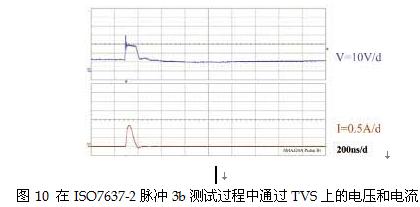以SMAJ24A為例,從產品數據表摘取這些參數與圖11的曲線進行比較,發現SMAJ24A符合ISO7637-2脈沖2測試的要求,可承受長達1.2ms的360 W指數脈沖,這個數值遠遠高于ISO7637-2脈沖2電涌強制的4μs時長。