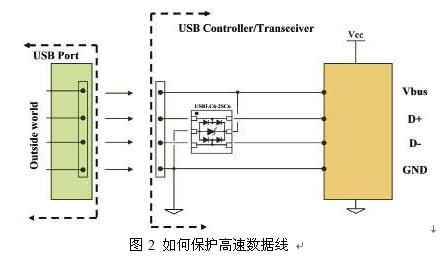 這個辦法的實質是在USB接口附近連接一個保護元器件。它由幾支采用軌對軌結構的二極管組成,本身具有低電容的特性。內部鉗位器件為兩條數據線提供±25kV ESD (ISO10605)保護功能,以及為Vbus電源線提供保護功能。