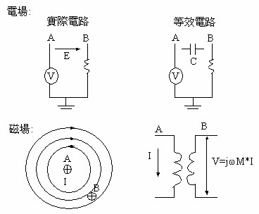 V是電壓,I是電流,R是電阻,Z是阻抗(R + jX),rf是指射頻能量。如果射頻電流存在于PCB走線中,且此走線具有一個固定的阻抗值,則一個射頻電壓將被產(chǎn)生,而且和射頻電流成正比。請注意,在電磁波模型中,R是被Z取代,Z是復數(shù)(complex number),它具有電阻(屬于實數(shù))和電抗(屬于虛數(shù))。
