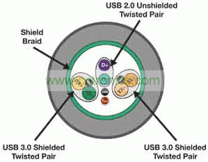 圖2 超高速USB電纜橫截面顯示了與2.0的差別