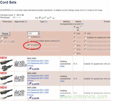 在網頁選型工具“cord sets”(電源線)中,選擇V-Lock標簽及諸如連接器類型、國家插頭或其它特性等選擇標簽,即可輕松選擇。