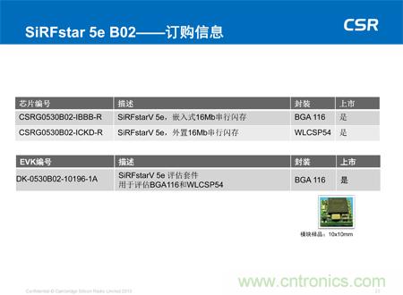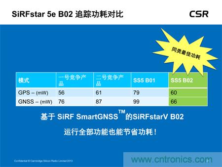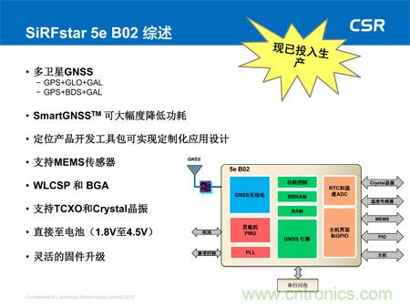 可穿戴設(shè)備應(yīng)用。該低功耗器件現(xiàn)已全面投入生產(chǎn),不僅可大幅度降低功耗且不影響定位精度,還可提供多衛(wèi)星GNSS支持,可滿足所有地區(qū)對(duì)GNSS的需求,包括美國的GPS、歐洲的伽利略、俄國的Glonass及中國的北斗衛(wèi)星系統(tǒng)。此外,SiRFstar 5e B02還搭載了CSR全新的SmartGNSS技術(shù),可提供兩種模式最大程度地降低功耗,并能夠根據(jù)信號(hào)條件及衛(wèi)星可用性自主管理GNSS系統(tǒng)的應(yīng)用。
