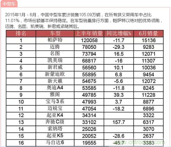 2015年1月-6月,中國乘用車銷量超過千萬輛,達到1009.56萬輛,同比增長4.80%,比上年同期回落6.38個百分點。其中基本型乘用車(轎車)銷售