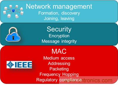 IEEE 802.15.4標準被用作目前市面上很多常見網絡互連標準的數據鏈路層,例如6LoWPAN、Wi-SUN、ZigBee®、Thread和WHART等。由于諸如空中調停(通過CSMA-CA實現)、接受、重傳以及內置AES安全性等特性,其保障了無線基礎的穩定。