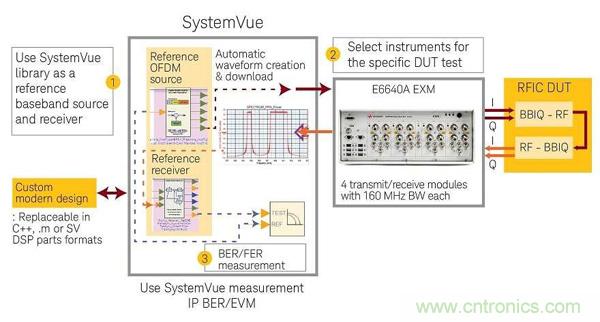 圖1:圖中顯示初期的802.11ax裝置評估流程圖。流程的核心是Keysight systemVue ESL軟體,它具有強(qiáng)大的功能及靈活性,可解決與802.11ax裝置設(shè)計和測試相關(guān)的挑戰(zhàn)。藉由SystemVue,在標(biāo)準(zhǔn)草案階段所開發(fā)出的IP,可快速連接到各種儀器進(jìn)行設(shè)計驗證測試。