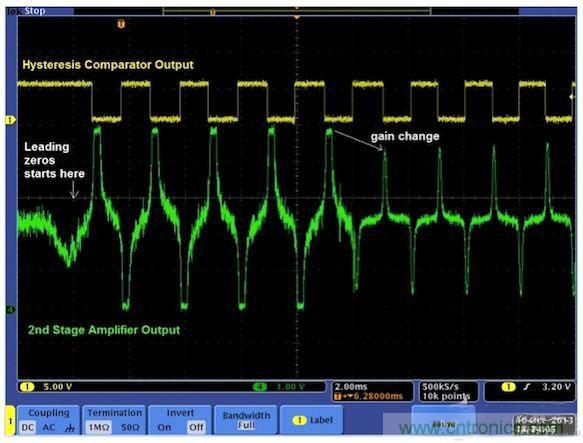 至此仍然存在增益更新之前是否有數(shù)據(jù)丟失的問題。為了避免這個(gè)問題,磁卡的兩頭會(huì)用前導(dǎo)零進(jìn)行編碼以實(shí)現(xiàn)同步(這樣可以支持雙向劃卡)。這樣做的目的是使解碼器同步于劃卡速度。舉例來說,在磁道1中,共有約62個(gè)前導(dǎo)零。磁道1具有210個(gè)比特的數(shù)據(jù)密度。因此我們可以估算出劃卡速度為5 IPS時(shí)前導(dǎo)零將持續(xù)約60ms時(shí)間,劃卡速度為50 IPS時(shí)前導(dǎo)零將持續(xù)6ms.對(duì)另外兩個(gè)磁道來說或多或少是相同的,如圖7所示。在人為劃卡時(shí)一開始就是50 IPS的劃卡速度是不可能,因此系統(tǒng)具有比6ms長(zhǎng)得多的時(shí)間來測(cè)量峰值并調(diào)整增益。圖8顯示了增益控制過程。