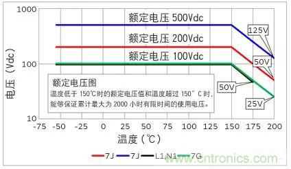 產品溫度超過150℃時,請按照下面的額定電壓降低施加在電容器上的電壓再使用。