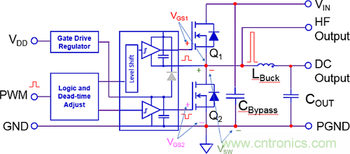為了闡述各類GaN功率器件的測量技術和要求,我們采用如下的EPC公司的氮化鎵場效應晶體管(eGaN FET):(i)高速、10MHz開關頻率、基于65V eGaN FET 的EPC8009半橋開發板(圖1的Q1和Q2 );以及(ii)低速、500kHz開關頻率的EPC9080半橋演示板,該演示板使用100V eGaN FET EPC2045作為頂部開關(Q1)和100V EPC2022作為底部開關(Q2)器件。如圖1所示,兩個電路板均被配置為降壓轉換器。
