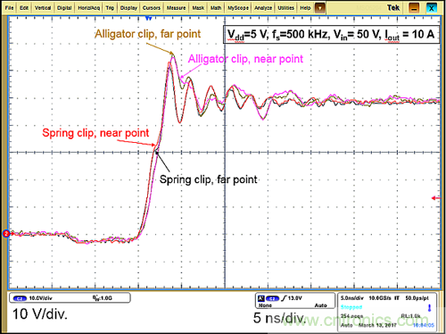 圖4的測得波形清楚地表明,探頭技術比測量點的選擇重要。雖然有邊緣衰減,紅色和黑色波形幾乎相同。無論測量點的選擇如何,使用鱷魚夾時的波形形狀都非常不準確。我們建議,彈簧夾技術應與最靠近功率器件的測量點(“近點”)結合使用。