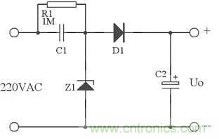 在實際應用中,可以用下圖代替上圖,這里用了Z1正向特性和反向特性,其反向特性(也就是其穩壓特性)來穩定電壓,其正向特性用來在市電負半周給C1提供放電回路。
