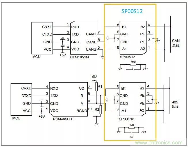 另一種方案則是采用ZLG的SP00S12浪涌保護(hù)模塊,可用于各種信號(hào)傳輸系統(tǒng),抑制雷擊、浪涌、過(guò)壓等有害信號(hào),對(duì)設(shè)備信號(hào)端口進(jìn)行保護(hù)。搭配ZLG的全隔離CTM或SC系列的隔離CAN收發(fā)器,如下圖。可極大程度的提升產(chǎn)品的集成度,于此同時(shí)極大程度的縮小開(kāi)發(fā)周期。