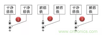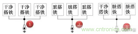 第1種方式干凈搭鐵回路之間的回路并接是允許的;第2種臟搭鐵回路之間的回路并接也是完全可以接受的;對于第3種臟搭鐵與干凈搭鐵回路并接,通常是可以接受的,但需要得到相關(guān)專業(yè)的評審?fù)ㄟ^。