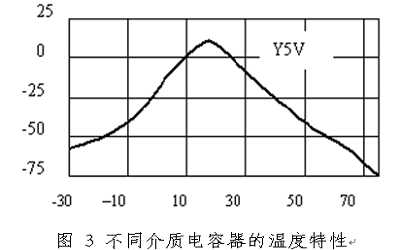 由于電容器中的介質(zhì)參數(shù)受到溫度變化的影響,因此電容器的電容值也隨著溫度變化。不同的介質(zhì)隨著溫度變化的規(guī)律不同,有些電容器的容量當(dāng)溫度升高時會減小70%以上,常用的濾波電容為瓷介質(zhì)電容,瓷介質(zhì)電容器有超穩(wěn)定型:COG或NPO,穩(wěn)定型:X7R,和通用型:Y5V或Z5U三種。不同介質(zhì)的電容器的溫度特性如圖2所示。