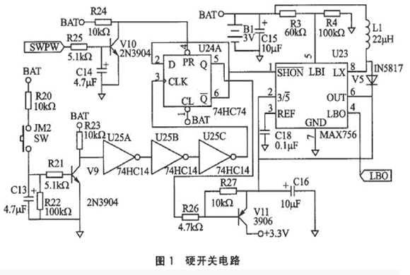 硬開(kāi)關(guān)電路是將2節(jié)7號(hào)電池的串聯(lián)電壓通過(guò)DC/DC轉(zhuǎn)換器MAX756轉(zhuǎn)換成3.3 V的電壓,電路圖如圖1所示。如果不經(jīng)升壓電路而直接由電池供電,那么因電池端產(chǎn)生的電壓存在一個(gè)由高到低的下降過(guò)程。2節(jié)新電池的串聯(lián)電壓在3 V以上,隨著能量的耗盡,會(huì)下降到2V以下,導(dǎo)致機(jī)器無(wú)法正常工作。JM2按鍵為開(kāi)/關(guān)機(jī)鍵,在按動(dòng)JM2時(shí),由于按鍵的抖動(dòng),會(huì)產(chǎn)生誤動(dòng)作。由R20, C13, R21,R22, R23, V9構(gòu)成的充放電回路,作用是通過(guò)適當(dāng)?shù)剡x擇R20,C13,R21的值,使充放電回路的充電時(shí)間與放電時(shí)間都大于鍵抖動(dòng)時(shí)間,從而有效地消除鍵的抖動(dòng)。V9集電極輸出的按鍵脈沖經(jīng)去抖后,再通過(guò)U25 (74HC14)三個(gè)帶施密特觸發(fā)器的反相器進(jìn)一步濾波整形,產(chǎn)生波形完整的單脈沖。由該脈沖觸發(fā)U24A(74HC74 D觸發(fā)器)的翻轉(zhuǎn)。