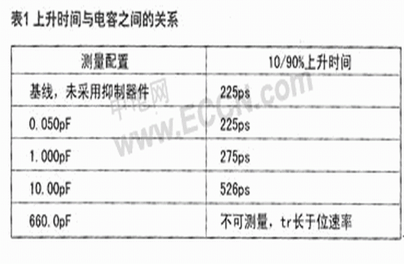 通常,USB 2.0支持480Mbps(bits per second)的數(shù)據(jù)傳輸;DVI和HDMI協(xié)議更是分別支持高達(dá)8Gbps和5Gbps的數(shù)據(jù)傳輸帶寬。在USB2.0、DVI和HDMI的高速數(shù)據(jù)率下,傳統(tǒng)保護(hù)裝置的寄生電容可能破壞信號(hào)的完整性或令其失真。失真表現(xiàn)為由較慢的上升和下降時(shí)間所致的高態(tài)/低態(tài)瞬變的前沿和后沿被修圓。上升和下降時(shí)間較慢會(huì)給系統(tǒng)帶來一些問題,其中最重要的是時(shí)序問題。電路在特定的時(shí)間需要穩(wěn)定的"高"態(tài)和"低"態(tài)。隨著各狀態(tài)之間過渡時(shí)間的增加,電路有可能檢測到不完整的過渡期,從而將數(shù)據(jù)誤差引入系統(tǒng)。附表1是不同寄生電容ESD抑制器件對(duì)數(shù)據(jù)上升沿時(shí)間(10%至90%高電平)所造成的影響比較。