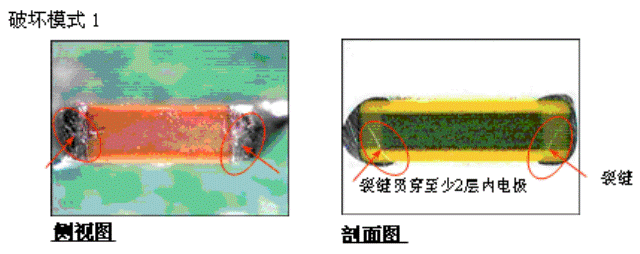 貼片式陶瓷電容的內部裂縫能引起嚴重的破壞。如果在PCB組裝過程中,貼片式陶磁電容器招受到剪應力,一種板彎裂縫將會在陶磁內部產生,這些裂縫有可能貫穿電容內部多層內部正負電極層,這樣可能導至短路的風險。典型的板彎破壞裂縫模式如下圖所示。這些短路模式可能導至電容過熱而造成嚴重的燒毀熔融現象。