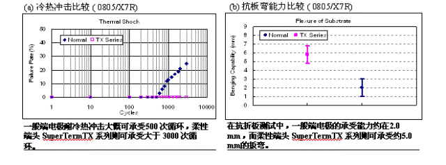 禾伸堂 開發出柔性端電極 “Super Term”系列(料號編碼原則中后綴帶TX 字母), 此類端電極多了一層〝彈性層〞結構,此〝彈性層〞 能有效吸收外應力,降低裂縫的發生機率從而提高整體產品的可靠性。柔性端電極 “Super Term”系列產品大都應用在對貼片電容質量要求較嚴苛的線路上,例如汽車電子、高溫環境、電源線路、TFT-LCD逆變器等場合。.