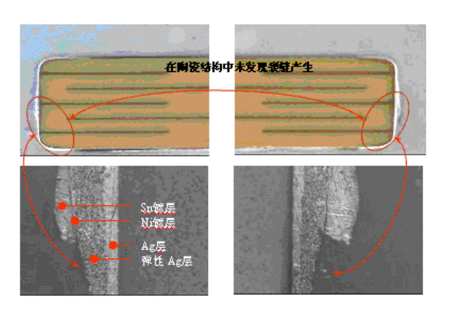 在破壞性的抗折板測試中,PCB板將持續彎曲直到貼片電容產生破壞為止,在這種模擬比較實驗中,可以發現具有柔性端頭設計的產品中,沒有在陶瓷結構中產生裂縫,而是從彈興銀層產生撕裂現象。