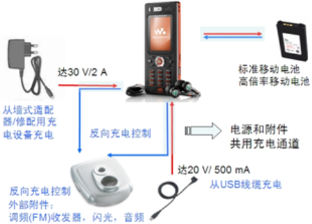 我們把普通墻式適配器或USB充電適配器到移動設備電池的通道稱為直接充電通道,而把移動設備電池到外部附件(如調頻收發器、負載揚聲器和閃光模塊)的通道稱為反向供電/充電通道(參見圖1移動設備的直接充電通道和反向供電/充電通道示意圖)。