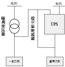 如圖一所示,這個是石化行業(yè)典型的兩電源的UPS構(gòu)架,由兩路電源,一個隔離變壓器、一臺UPS組成。UPS采用雙電源回路輸入,UPS主電源由電源1提供,UPS旁路電源有電源2提供,同時UPS設(shè)置一個脫機維修旁路,允許UPS在故障維修或者更換時,系統(tǒng)仍然能夠正常工作。同時DCS系統(tǒng)中的負(fù)載分為兩個級別,即一般負(fù)載和重要負(fù)載,重要負(fù)載(一級負(fù)荷)由UPS系統(tǒng)直接供電,一般負(fù)載(三級負(fù)荷)由電源2經(jīng)隔離變壓器后供電。
