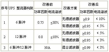 因此,在選擇UPS的同時,必需考慮相應(yīng)的功率因數(shù)及諧波改善措施。目前的主流的UPS的改善主要包括移相、無源濾波器、有源濾波器、混合式濾波幾種方案。其中移相是指在6脈沖整流器基礎(chǔ)上,增加一個移相變壓器后再增加一個6脈沖整流器,可以抑制諧波。機種諧波改善情況如下表所示: