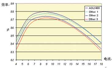 注意到圖2中,除了柵極結構,其他的部分就是標準的采用Trench工藝的MOSFET。柵極被分割成上下兩個部分,下部分用一些特殊的材料屏蔽起來,下部分在內部和上部分的柵極相連,而柵極的屏蔽層被連接到源極,從而減小漏極柵極米勒電容。用這種技術設計的MOSFET如AOL1464,其Vds為30V,Vgs在10V條件下Rds(on)為6.2mΩ,而其Crss只有20pF,極大地減小了開關過程中米勒平臺的持續的時間,降低了開關損耗。AOL1430,其Vds為30V,Vgs在10V條件下Rds(on)為2.5mΩ,而其Crss為50pF。圖3中,下管采用AOS的AOL1428,上管采用AOL1430和其他廠家目前Crss最低的器件的效率曲線,可見,上管采用AOL1430具有非常高的效率。注意:輸入電壓12V,輸出電壓 1.7V,開關頻率300kHz。