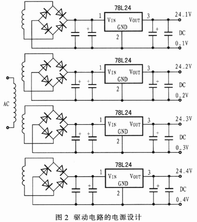驅(qū)動(dòng)電路需要4路相互隔離的直流電源為4路IGBT驅(qū)動(dòng)電路供電,用220V/22V變壓器對(duì)4路交流電源分別整流,用電容器和78L24型電壓調(diào)整器穩(wěn)壓后輸出4路24V直流電壓,如圖2所示。