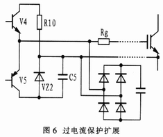 在實(shí)際應(yīng)用中,僅靠EXB841的6引腳檢測(cè)IG-BT集電極電壓來實(shí)現(xiàn)過流保護(hù)并不足以有效地保護(hù)IGBT,因此有必要在主電路中加接霍爾電流傳感器來檢測(cè)電路中的過流,如圖6所示。過流發(fā)生后,檢測(cè)電路檢測(cè)到電流,延時(shí)8μs后信號(hào)還存在的話。封鎖驅(qū)動(dòng)信號(hào)以關(guān)斷IGBT。在圖中,霍爾電流傳感器如果在主電路中檢測(cè)到過流信號(hào),其中的PNP三極管將導(dǎo)通,同時(shí),NPN三極管被截止,EXB841的6腳被懸空;當(dāng)沒有過流信號(hào)時(shí),PNP三極管不導(dǎo)通,NPN三極管導(dǎo)通,此時(shí)電路等效于擴(kuò)展前的電路。