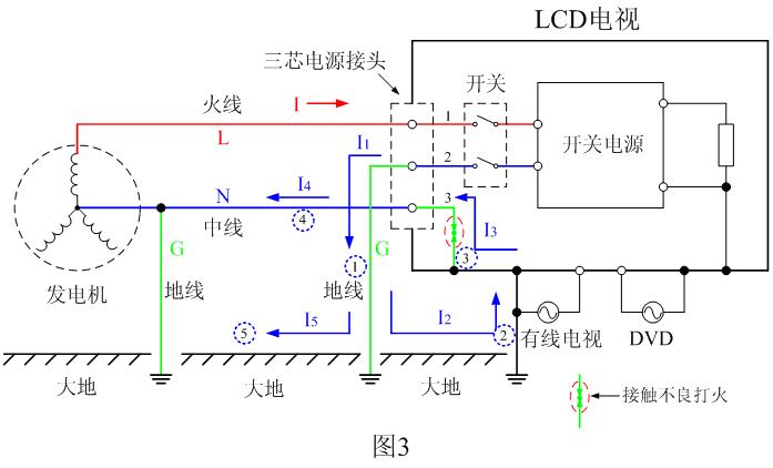 但電流I1沒(méi)有按圖2中的正常路線直接經(jīng)中線返回發(fā)電機(jī),而是經(jīng)地線(1)流入大地,然后電流I1在大地中被分成兩路I2和I5 ,I5直接通過(guò)大地(5)返回發(fā)電機(jī);而I2則通過(guò)大地與電視機(jī)的其它地線(2)(比如有線電視信號(hào)線或與電視機(jī)連接的其它設(shè)備連線)流回到電視機(jī)的外殼一端,I2電流經(jīng)過(guò)有線電視信號(hào)線接口(僅舉其中之一)后變?yōu)殡娏鱅3;I3再經(jīng)電視機(jī)內(nèi)的地線(3)以及電視機(jī)的三芯插頭3號(hào)線接頭,從三芯插頭3號(hào)線接頭流出,流出電流變成I4,電流I4再經(jīng)中線(4)流回發(fā)電機(jī)。