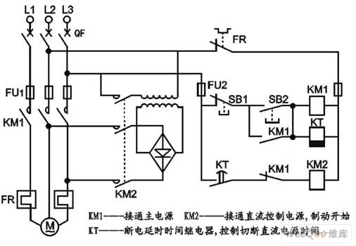 制動過程:按下停止按鈕SB1→KM1斷電,KM1主觸點斷開,電機脫離電源,KM1輔助常閉觸點恢復閉合,KM2通電,接入直流電源,制動開始,同時KM1輔助常開觸點又恢復斷開,則KT線圈呈斷電狀態(tài),延時開始,待所設延時時間到達后,KT的延時斷開常開觸點恢復斷開,KM2失電,切斷直流電源,制動結束。