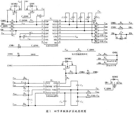 該保護系統采用精工電子三/四節串聯鋰離子可充電電池專用充、放電保護ICS-8254構建一級保護。S-8254系列內置高精度電壓檢測電路和延遲電路,針對各節電池進行高精度電壓檢測,實現單節過充電保護和單節過放電保護,并具備三段過電流檢測功能,通過外接電容可設置過充電檢測延遲時間、過放電檢測延遲時間和過電流檢測延遲時間1(過電流檢測延遲時間2和過電流檢測延遲時間3在芯片內部被固定)。該系統采用精工電子S-8244系列內置高精度電壓檢測電路和延遲電路的鋰離子可充電電池二級保護專用IC實現電池的單節二級充電保護,其保護延遲時間可通過外接電容的容值來設置。