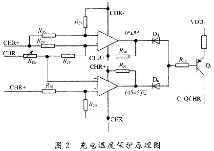 若誤將充電器的正、負極反接入系統中,則會由充電器和電池共同形成一個大電流回路,導致元器件損壞,甚至帶來更大的安全危害。該系統在充電回路中串接進一個防反接二極管D1,這樣即使充電器反接,因此時CHRl的電位將高于CHR+,由于二極管D1的存在,系統將構不成回路,從而對其起到了保護作用。