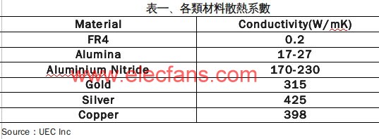 就LED芯片承載基板的發展上,以承載芯片而言,傳統PCB的基板材質具有高度商業化的特色,在LED發展初期有著相當的影響力。然而,隨著LED功率的提升,LED基板的散熱能力,便成為其重要的材料特性之一,為此,陶瓷基板逐漸成為高效能LED的主要散熱基板材料(如表一所示),并逐漸被市場接受進而廣泛使用。近年來,除了陶瓷基板本身的材料特性問題須考慮之外,對基板上金屬線路之線寬、線徑、金屬表面平整度與附著力之要求日增,使得以傳統厚膜工藝備制的陶瓷基板逐漸不敷使用,因而發展出了薄膜型陶瓷散熱基板,本文將針對陶瓷散熱基板在厚膜與薄膜工藝及其產品特性上的差異做出分析。