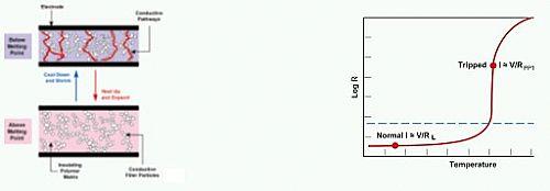 此時(shí)電阻可增加到原值的1000倍以上或更高倍數(shù)。電阻增加后,電路中的電流值減至可在故障情況下流動(dòng)的一個(gè)較低且穩(wěn)定的狀態(tài),因而保護(hù)了設(shè)備。在元件轉(zhuǎn)變?yōu)楦咦柚禒顟B(tài)下,可稱之為“已動(dòng)作”。元件將保持已動(dòng)作(高阻值)狀態(tài),直到故障清除并將設(shè)備的電源斷開,此時(shí),導(dǎo)電性聚合物冷卻下來并重新結(jié)晶,將PPTC元件恢復(fù)到較低阻狀態(tài)下,而受影響的設(shè)備也恢復(fù)到正常運(yùn)作狀態(tài)。